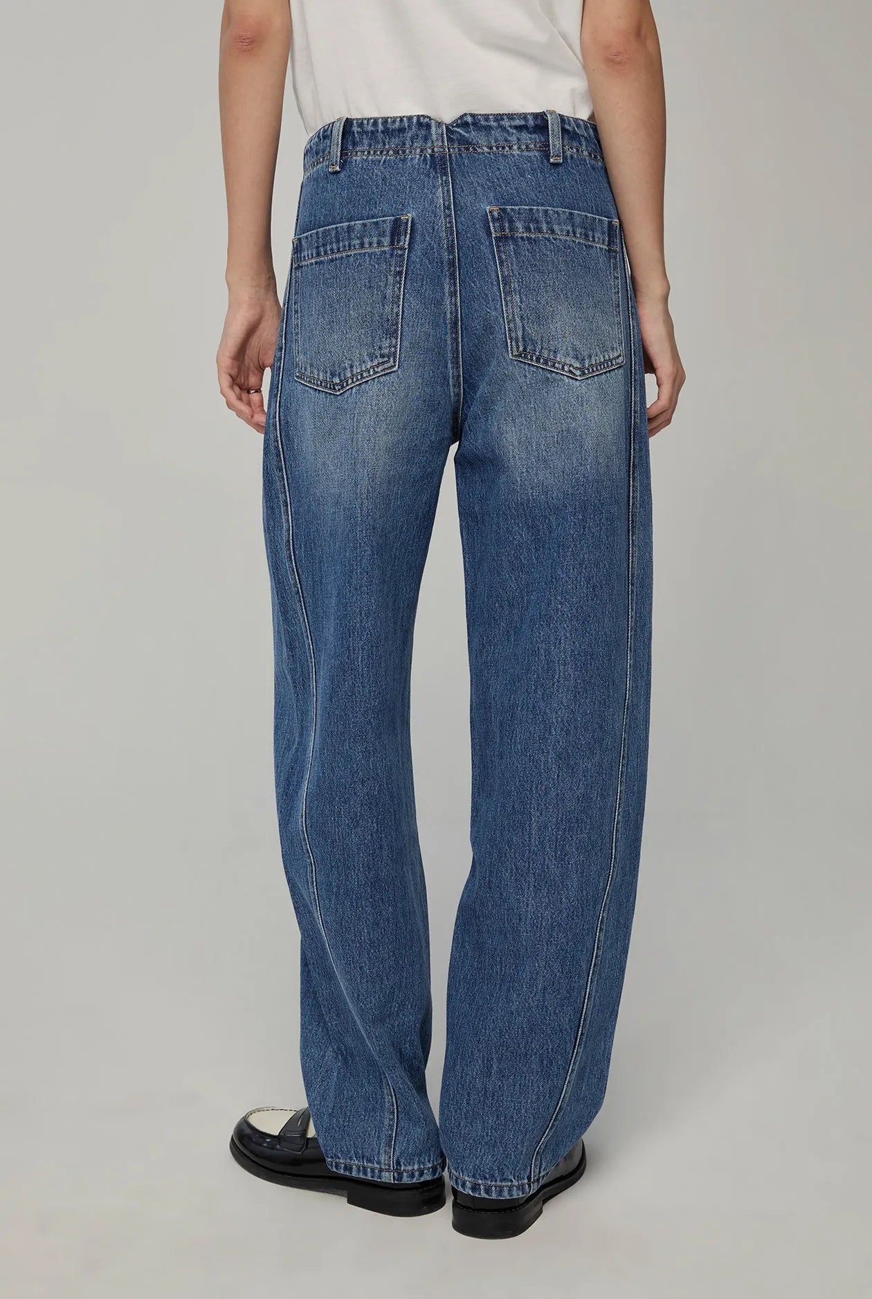 These barrel-leg jeans feature a slightly curved cut that tapers at the hem. Made in a dark blue wash with faded details at the front, they give off a vintage-inspired look. Style them with a light crop top and sunglasses for a chic finish.