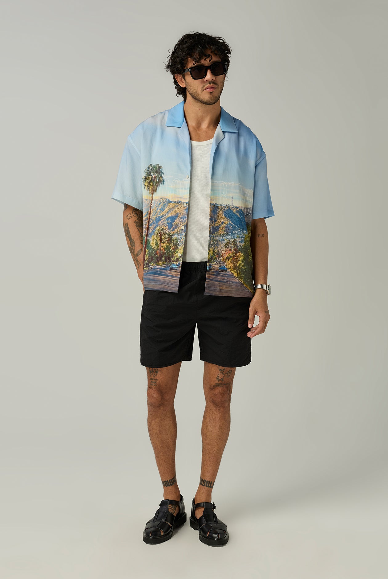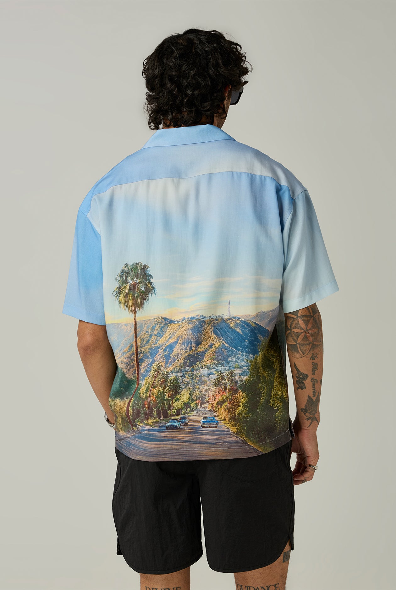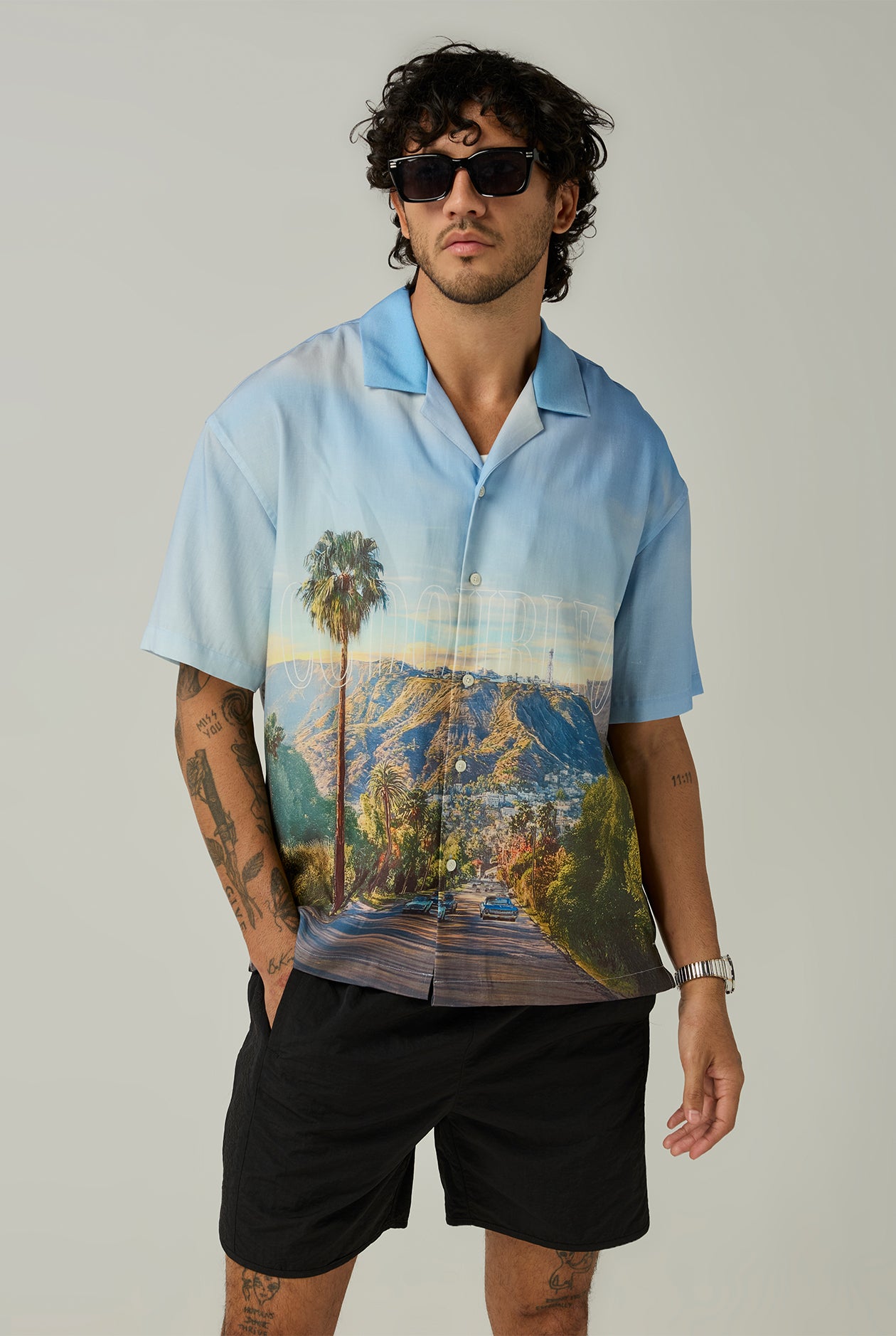A Hawaiian shirt features a blue-toned landscape print, giving a fresh twist compared to a classic standard Hawaiian pattern. It comes with an open-collar design and a front button placket to maintain a resort-style silhouette. The print is placed continuously across the body, making the overall look stand out and feel fashion-forward.