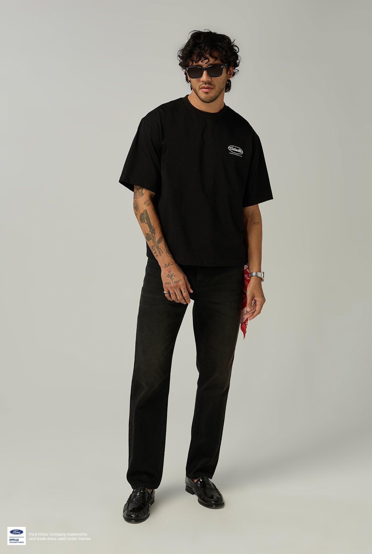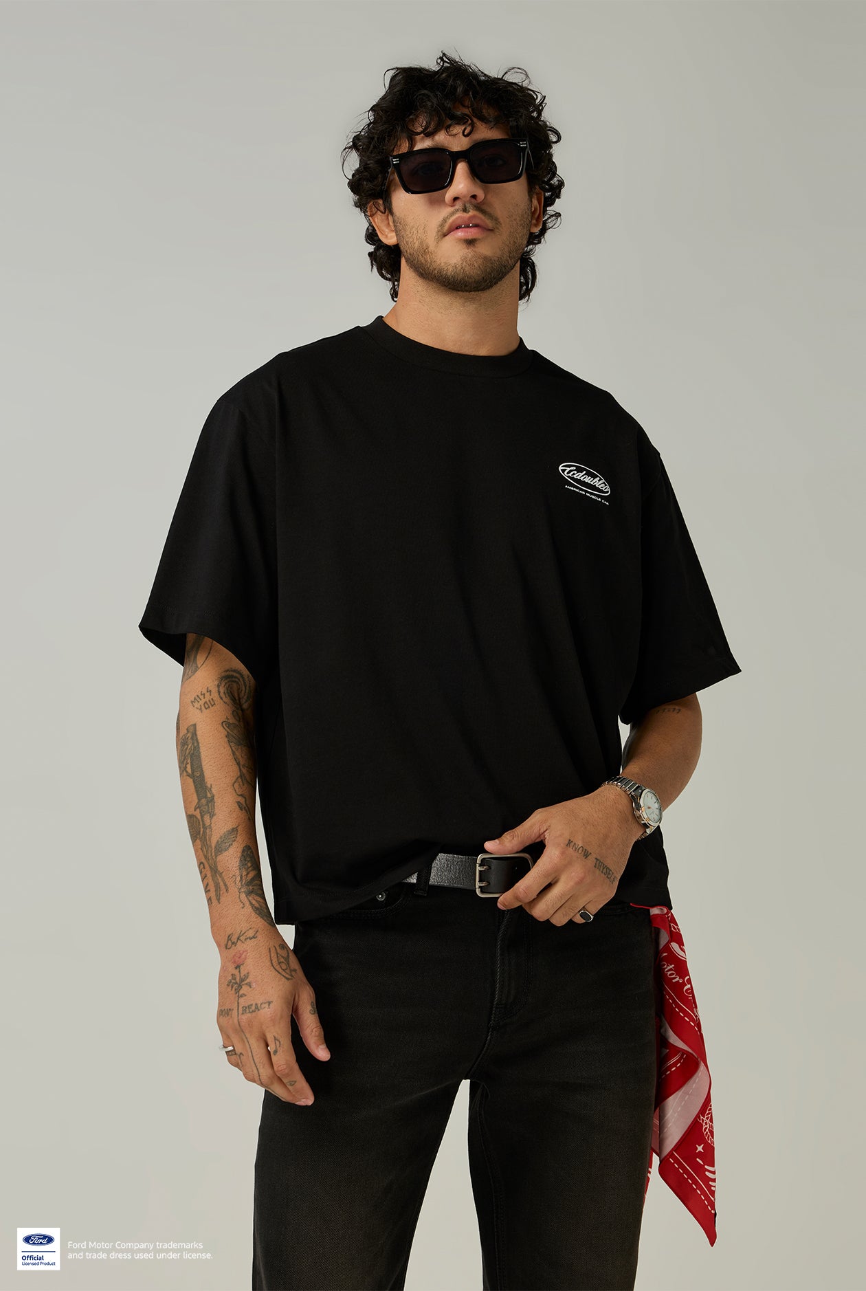 A boxy-fit black T-shirt from the CC DOUBLE O x FORD MUSTANG collection features a small brand logo printed on the left chest. The back showcases large โ€Fordโ€ and โ€Mustangโ€ lettering, along with a cobra graphic and a classic red car placed at the center. Below, it is finished with the text โ€1968 FORD MUSTANG COBRA JET.โ€ The modern silhouette pairs perfectly with a street-casual look, and styling it with jeans adds even more street character.