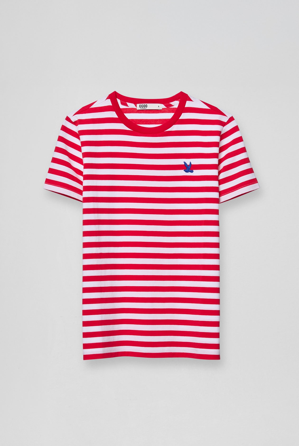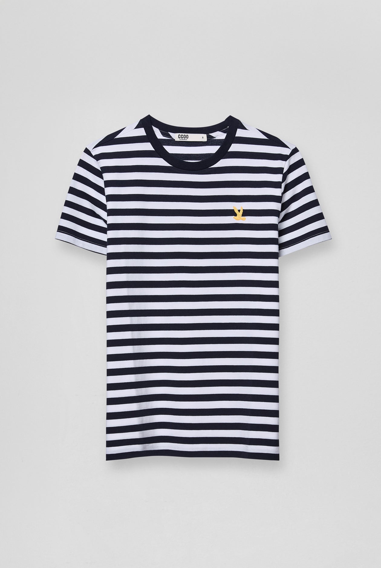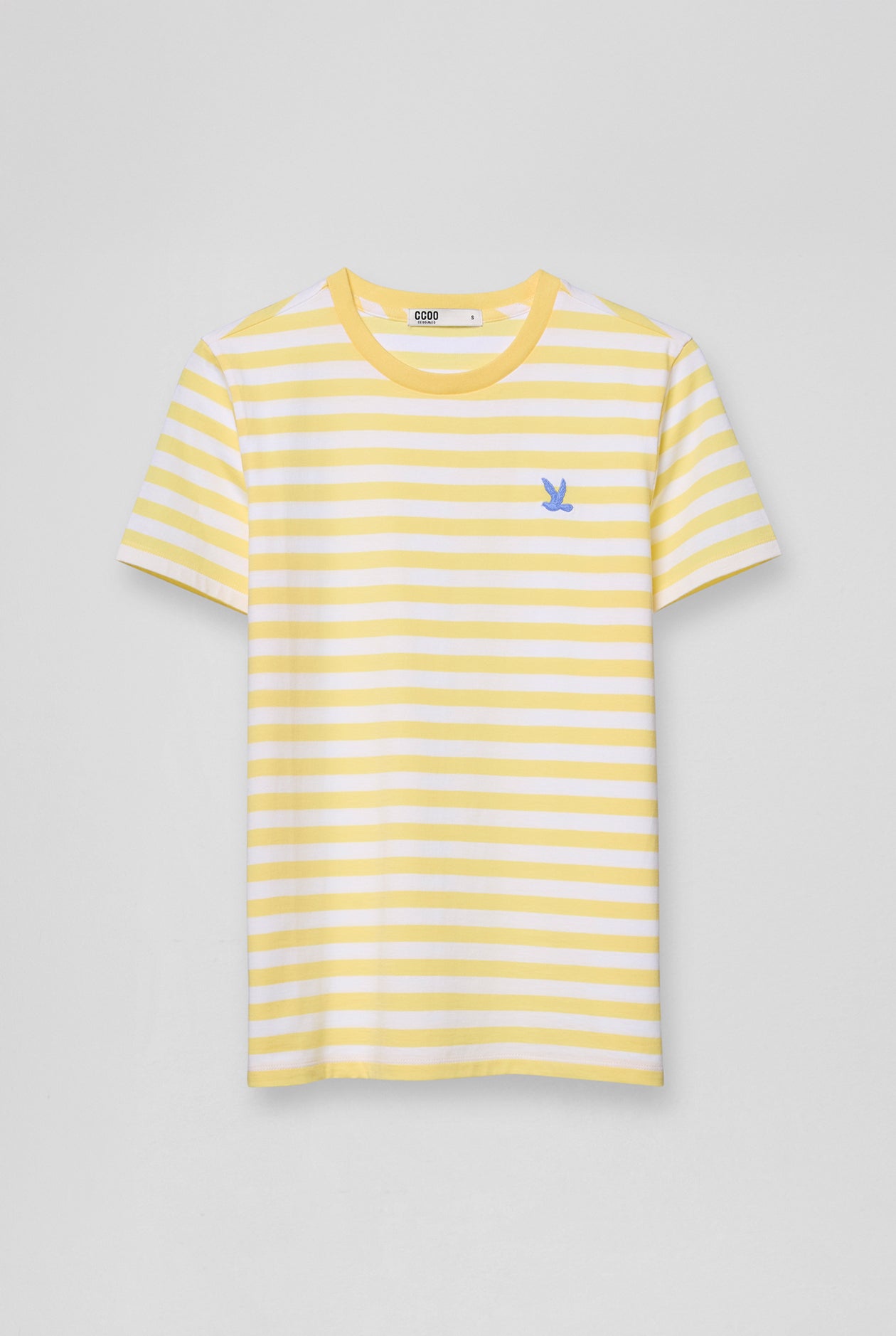 A great striped tee for a vibrant style. This top has a comfortable shape and features a small bird emblem stitched on the chest. The all-over line pattern adds a special touch, making your outfit noticeable with a clean look.