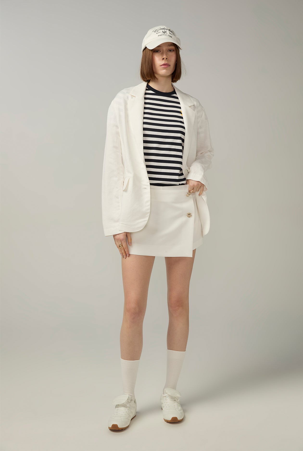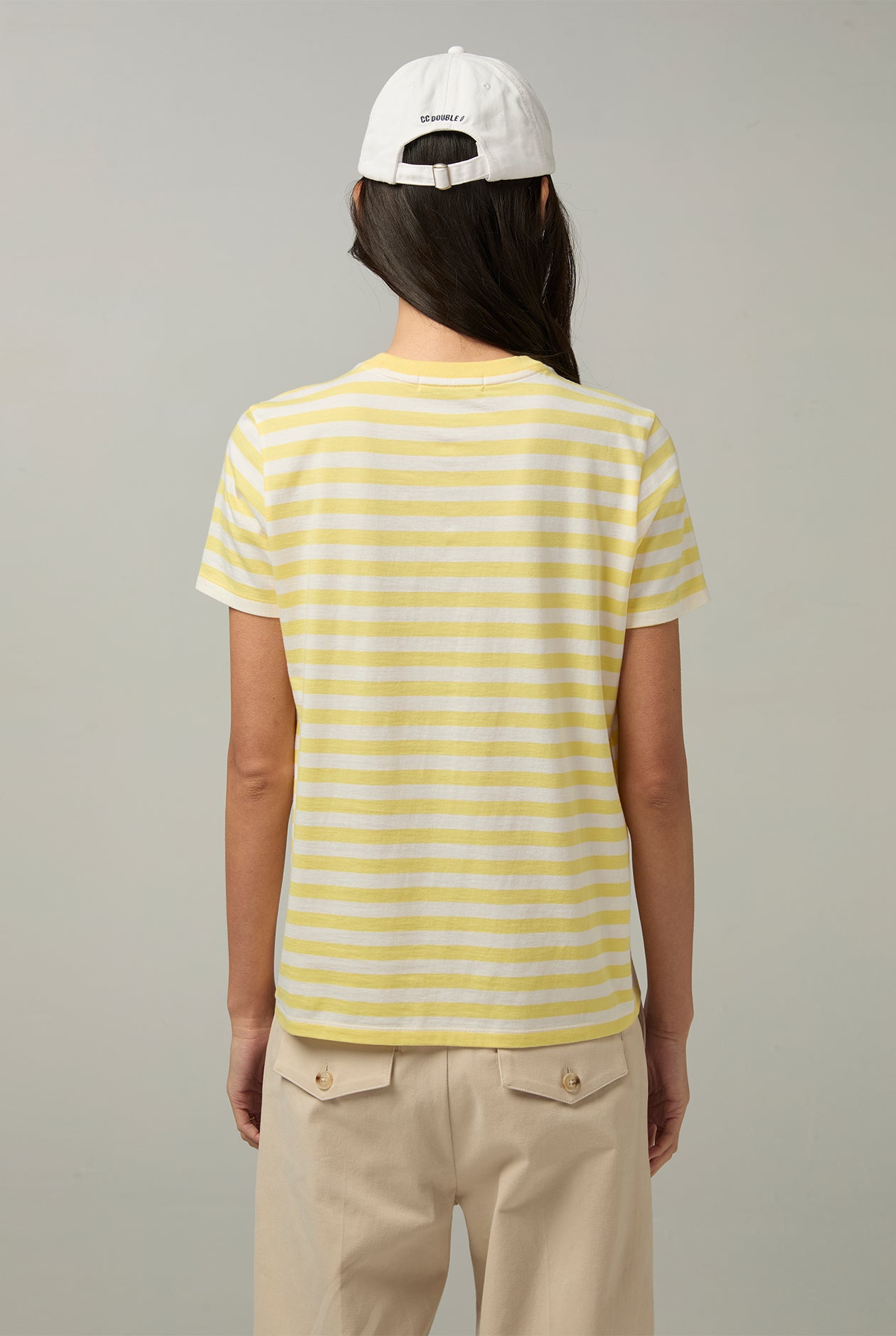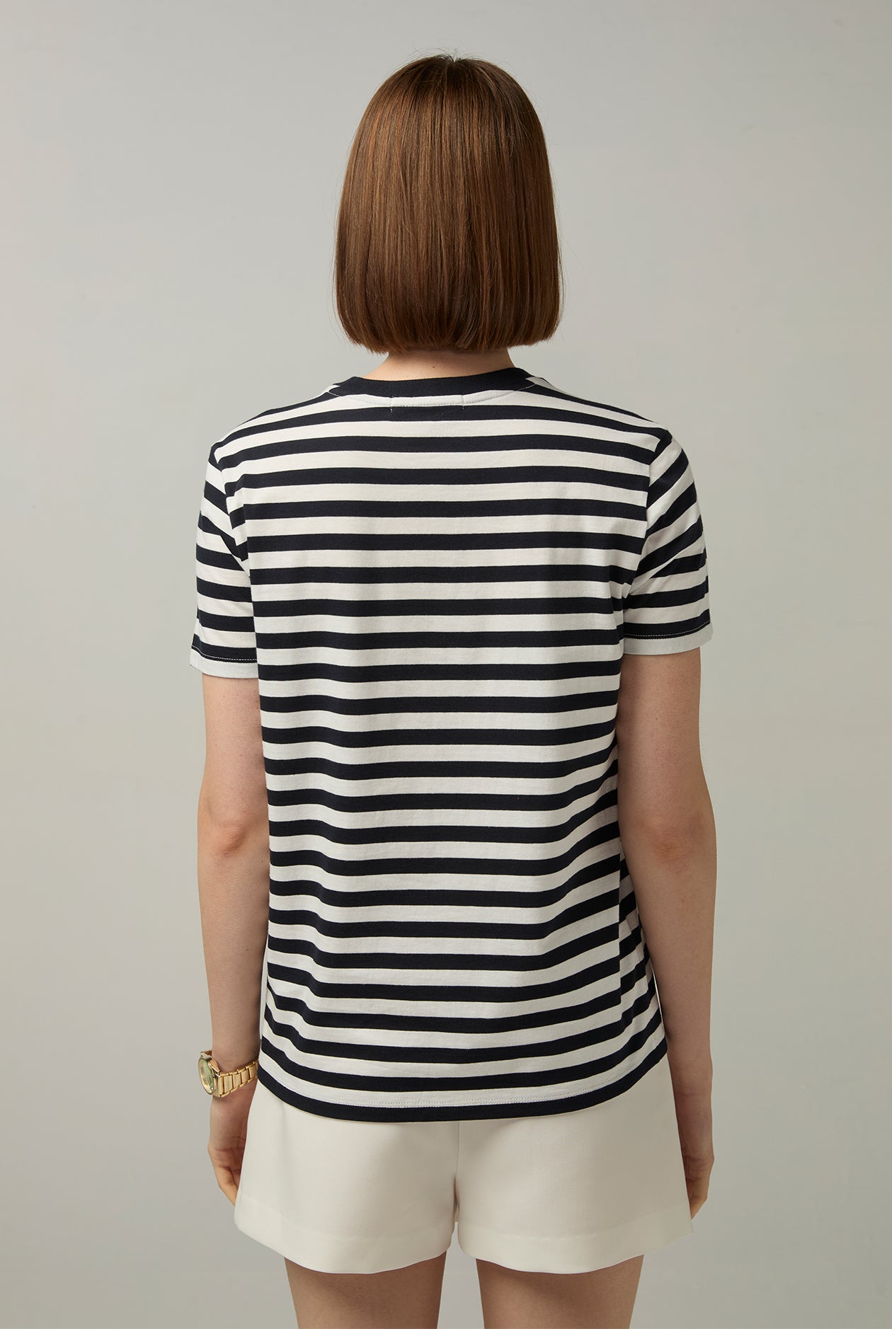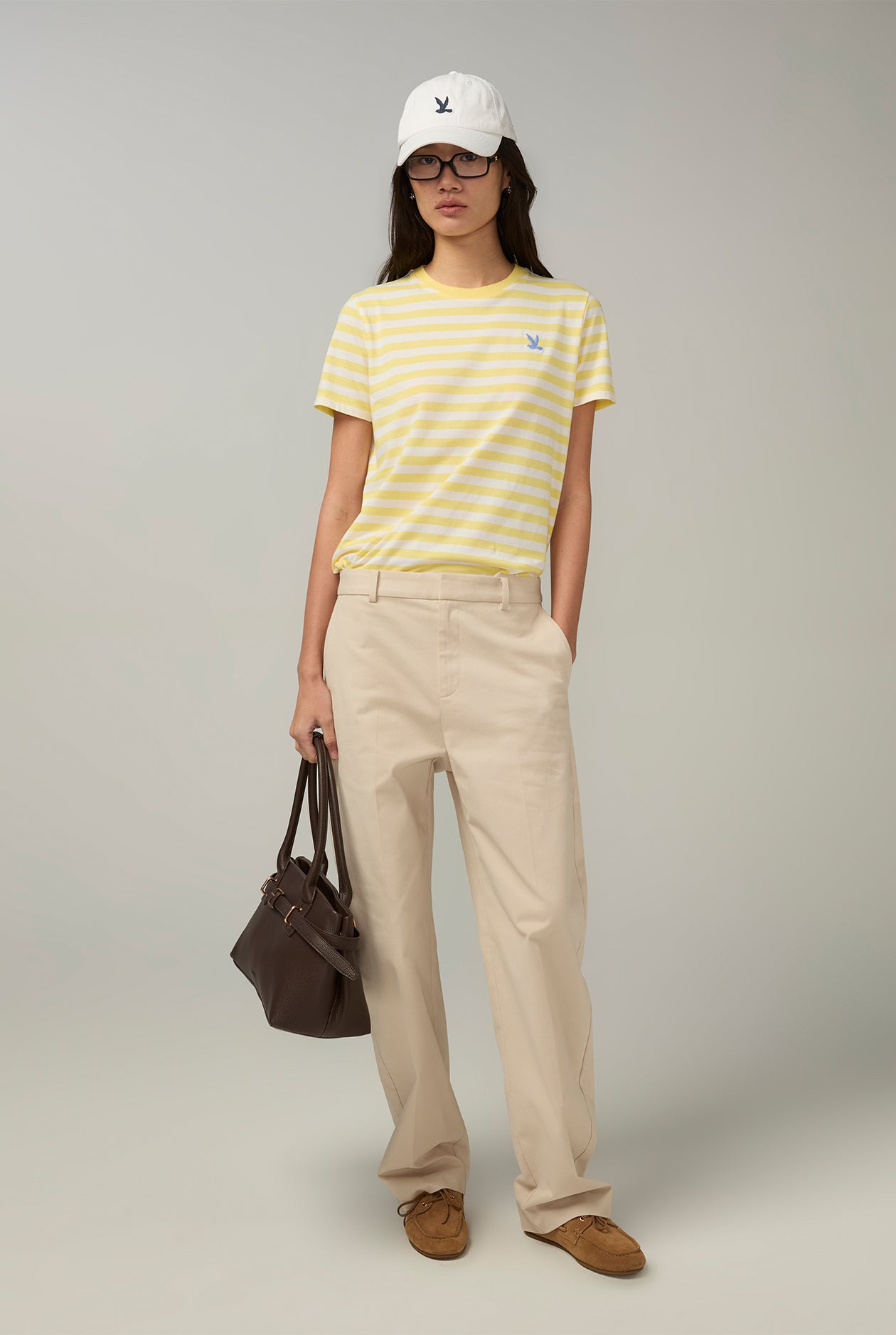 A great striped tee for a vibrant style. This top has a comfortable shape and features a small bird emblem stitched on the chest. The all-over line pattern adds a special touch, making your outfit noticeable with a clean look.