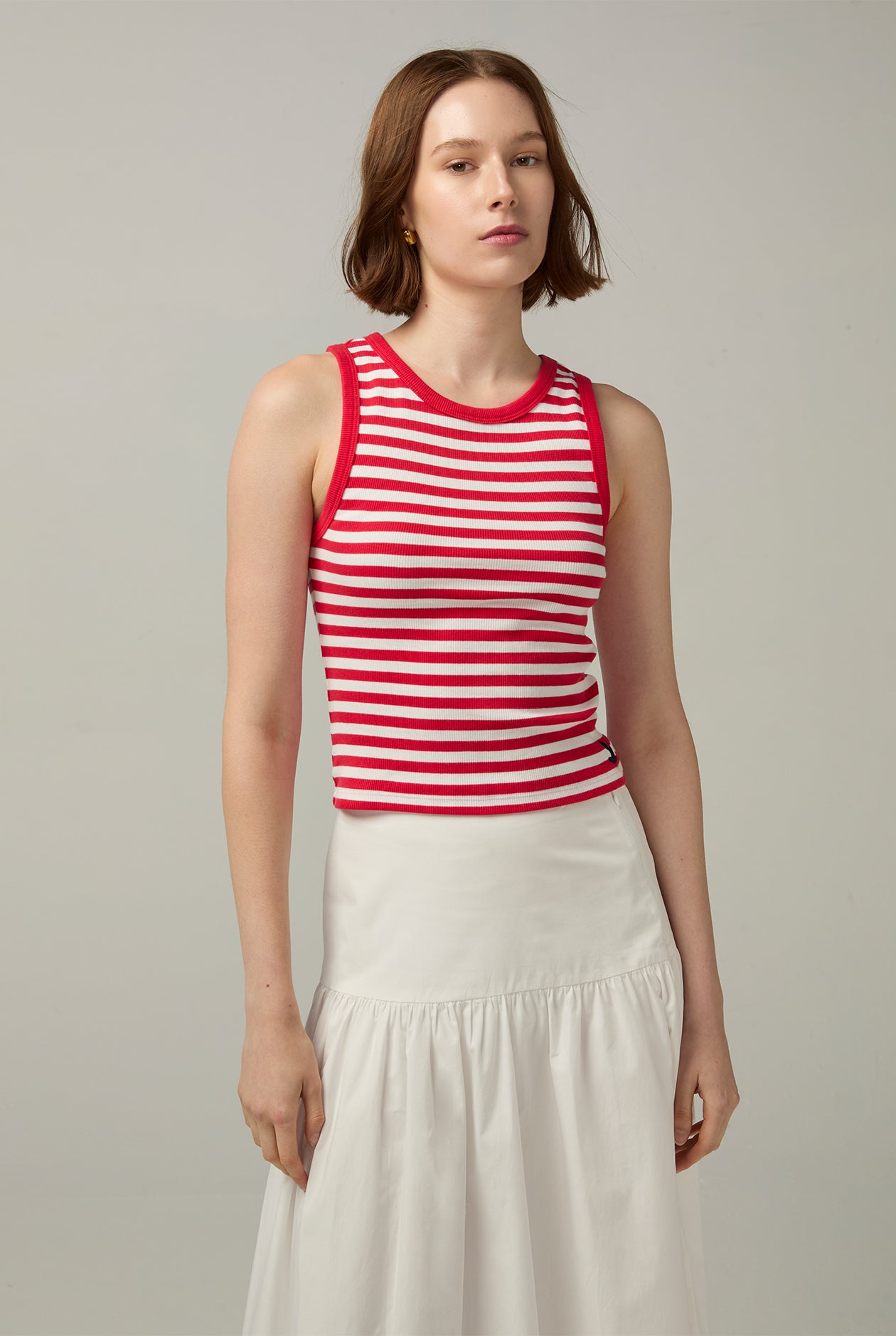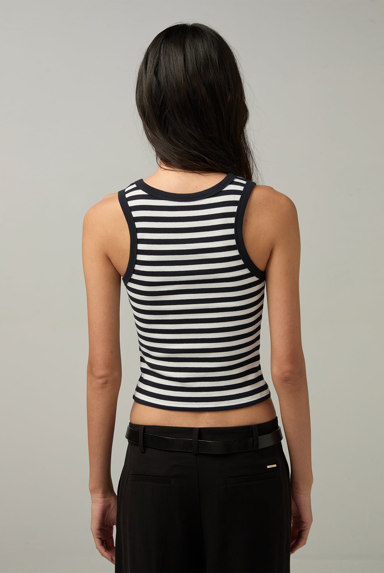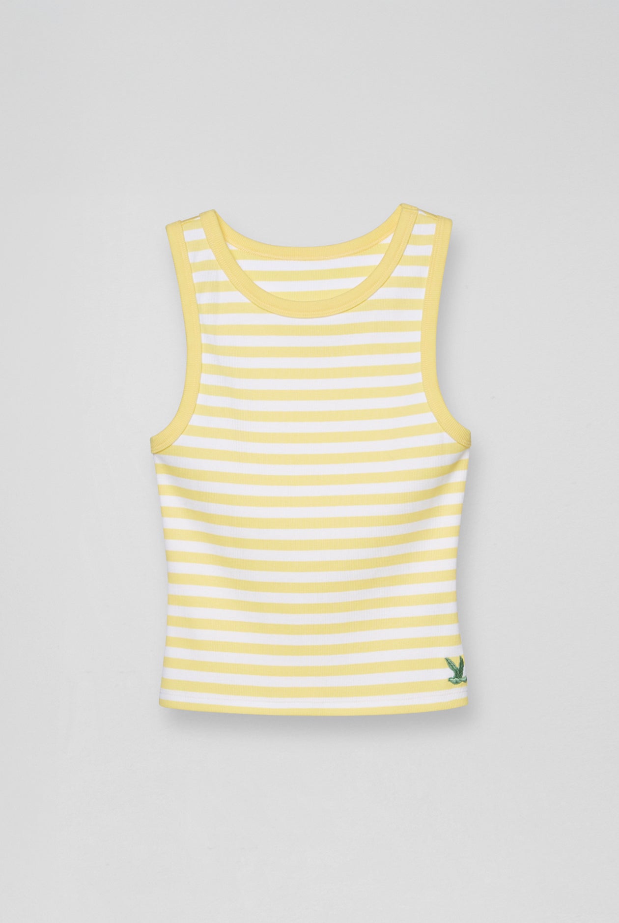 The striped tank top features a bird logo at the lower left hem. The slim fit reveals your figure in style. Alternating horizontal and white lines adds a playful touch of color to your outfit. Perfect for pairing with flared jeans or high-waisted shorts for a summer look that's both sporty and chic at the same time.