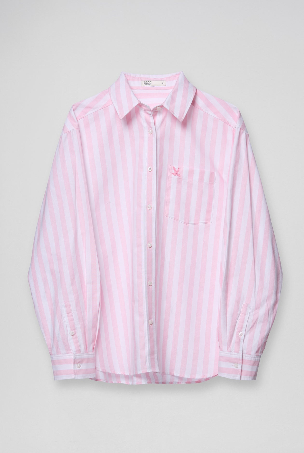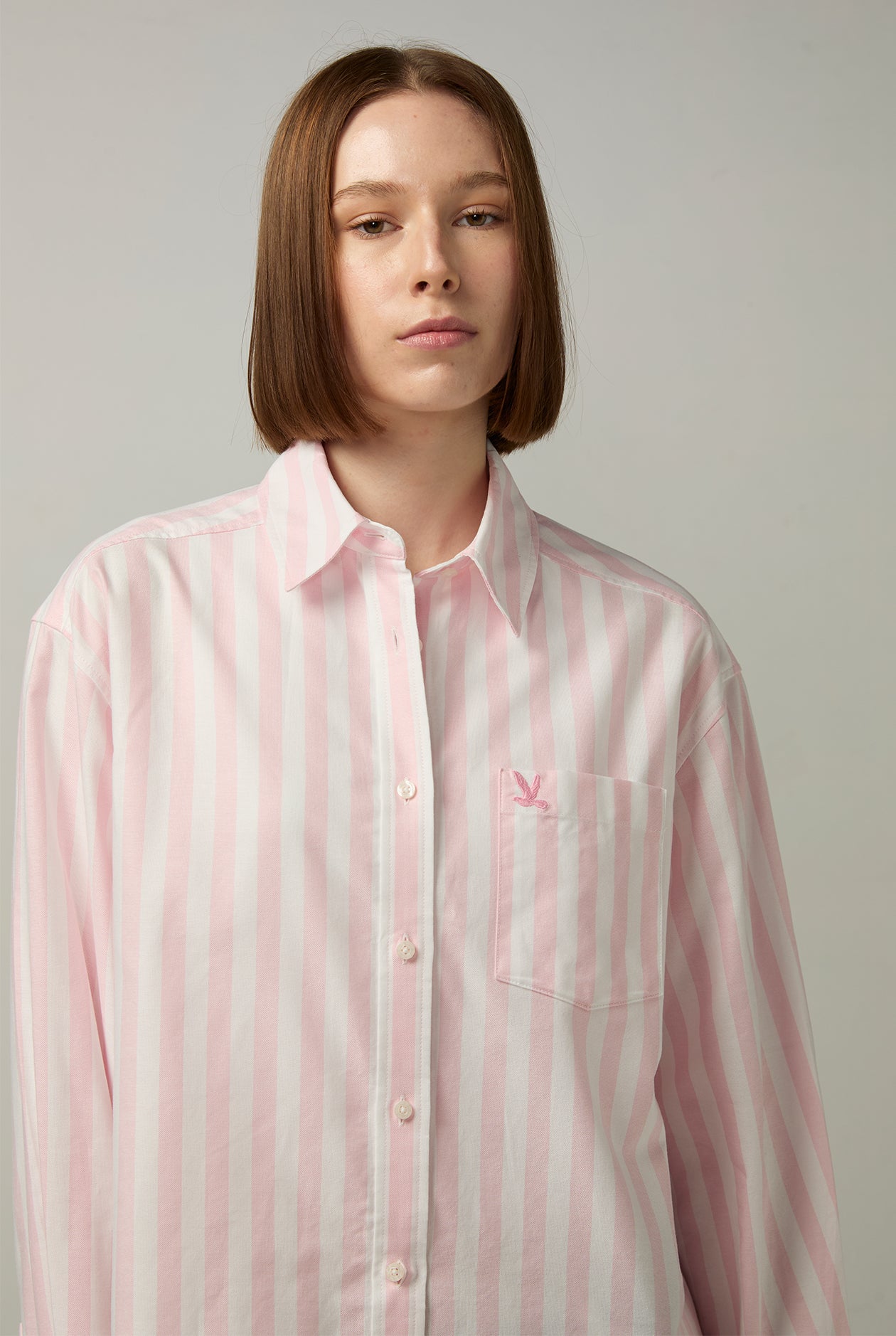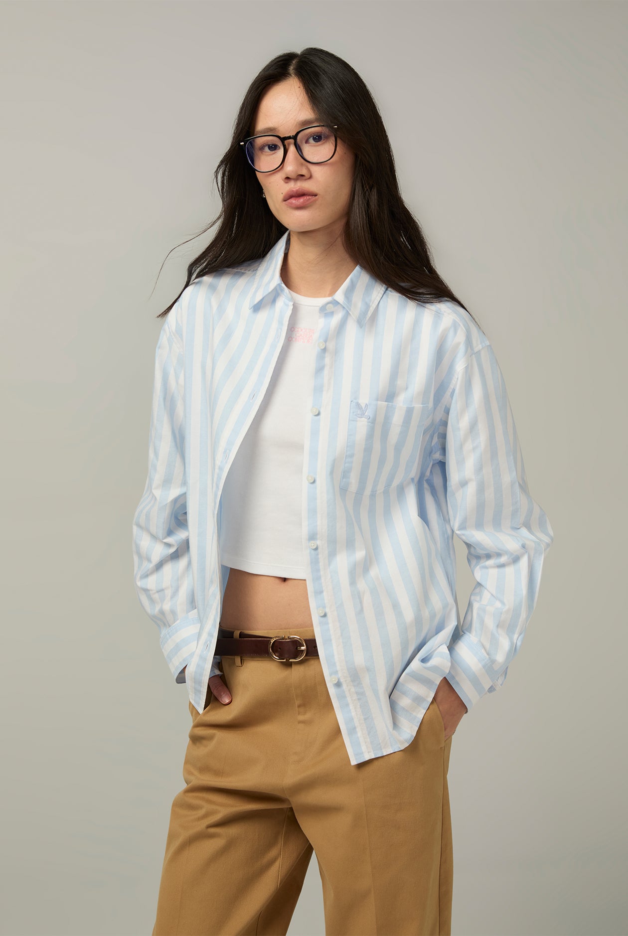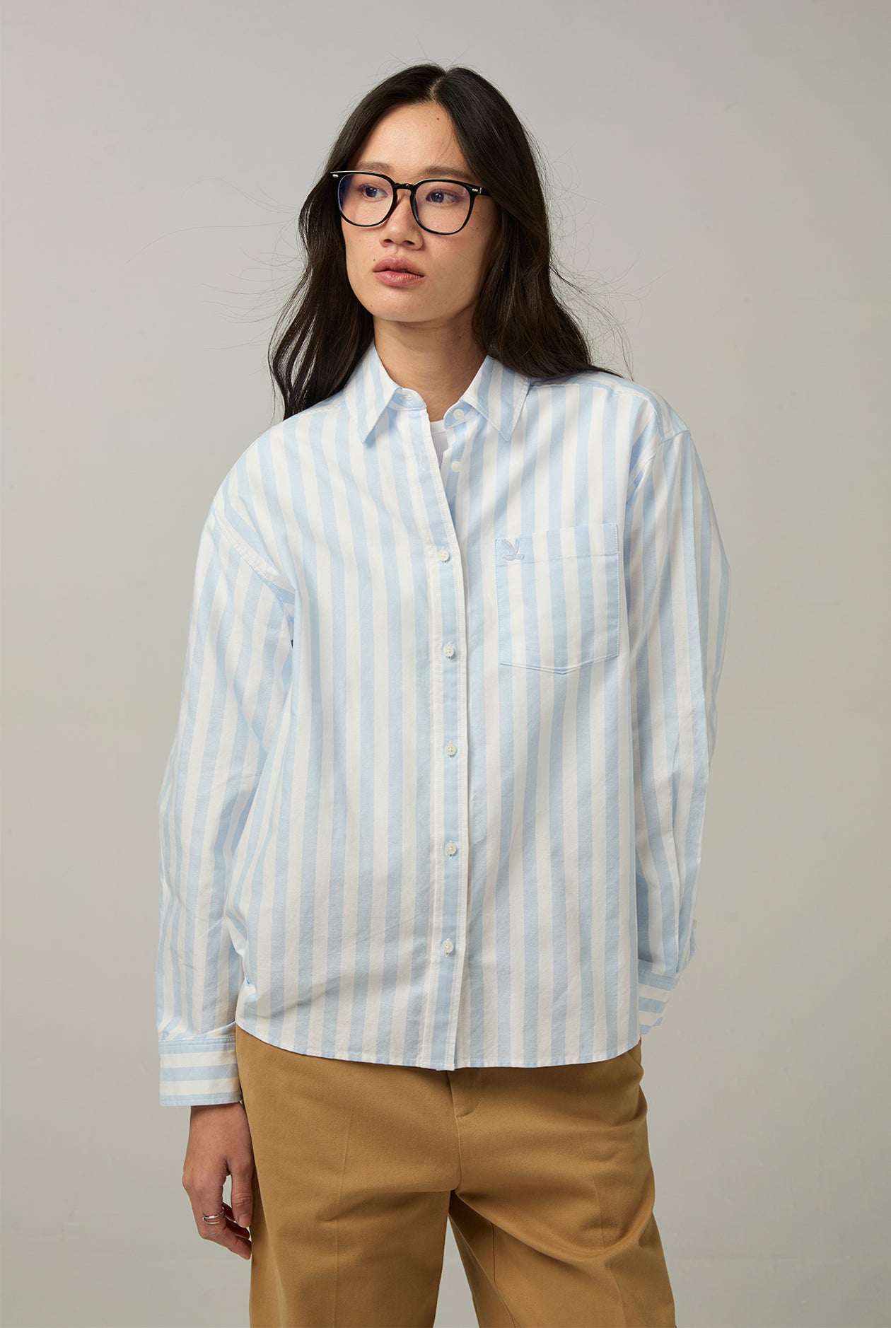 A classic striped shirt with a pocket on the left chest and an embroidered bird logo clearly reflecting the brand's identity. Vertical lines help to make the figure look slim and smart. Pastel tones give a soft yet confident feeling. Perfect for girls who want a neat casual look or wide-leg jeans to add a balance between cool and polite. Can be worn alone or layered over a crop top to add dimension to the look.