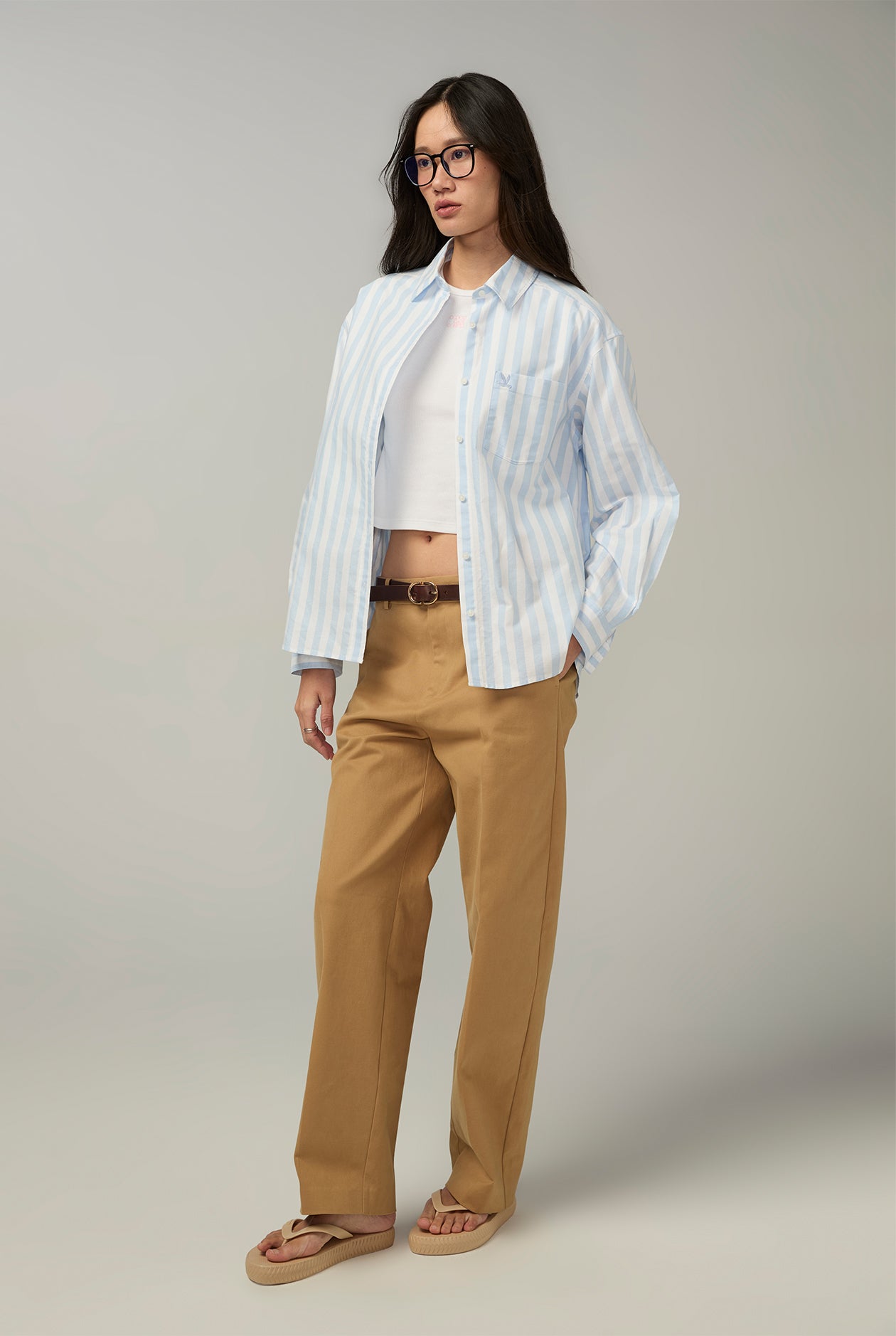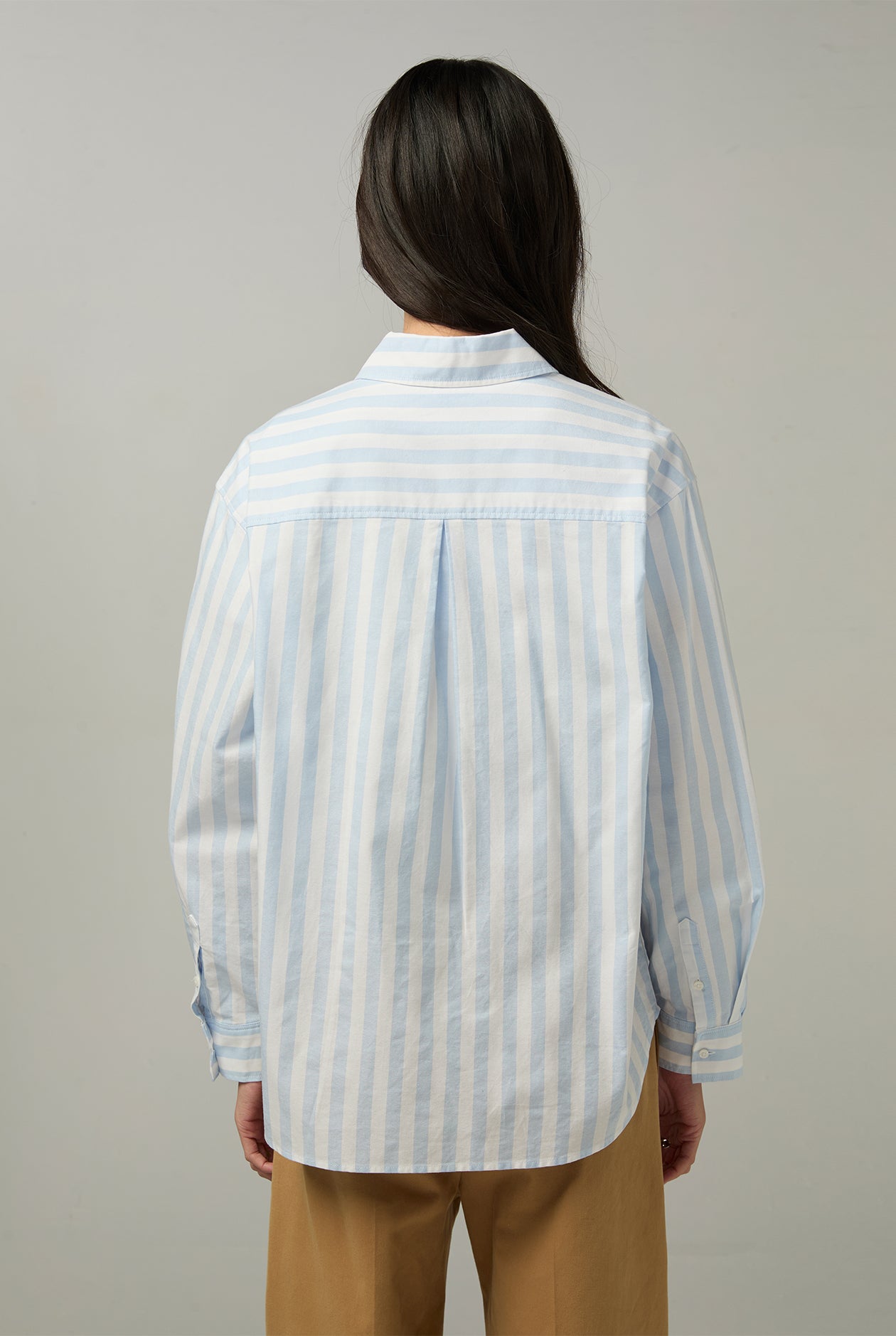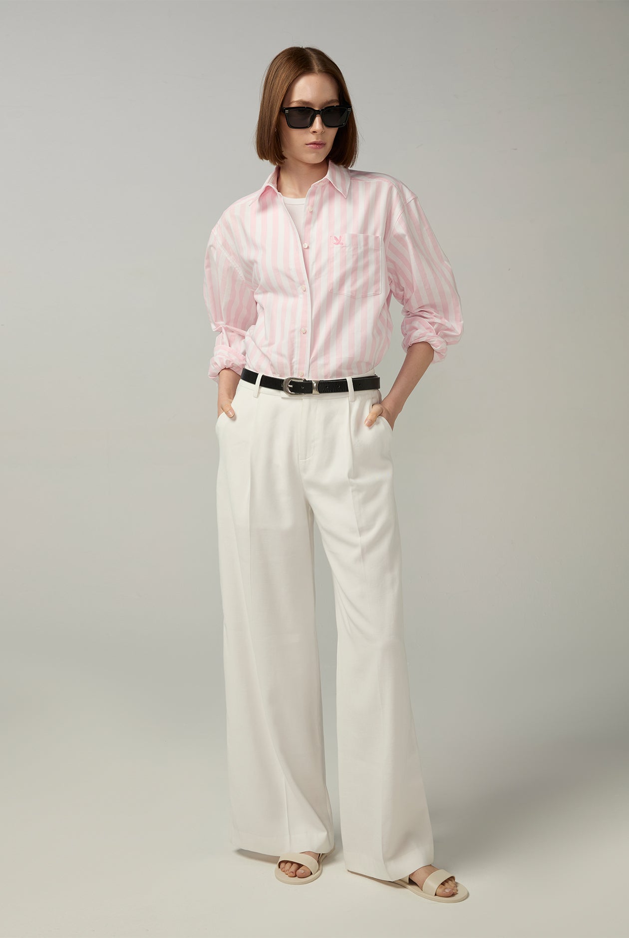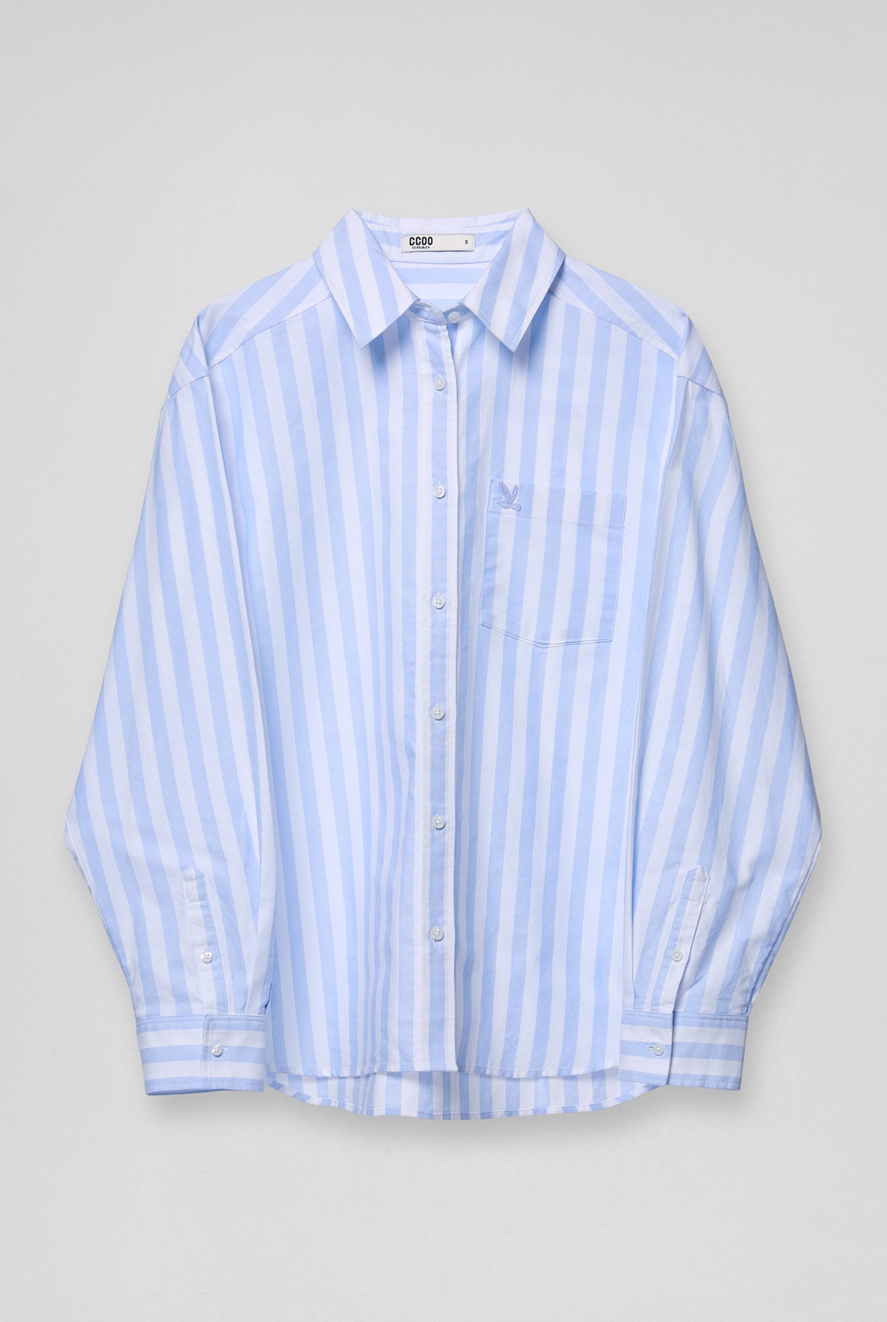 A classic striped shirt with a pocket on the left chest and an embroidered bird logo clearly reflecting the brand's identity. Vertical lines help to make the figure look slim and smart. Pastel tones give a soft yet confident feeling. Perfect for girls who want a neat casual look or wide-leg jeans to add a balance between cool and polite. Can be worn alone or layered over a crop top to add dimension to the look.