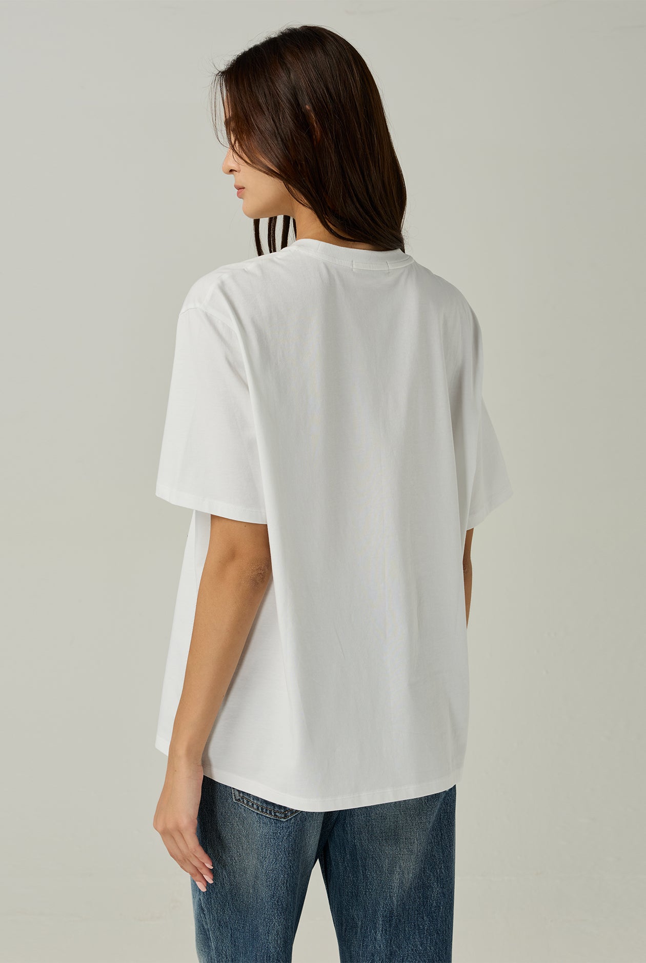 A crewneck oversized T-shirt highlighted by a front Illustration graphic, and fringe earring that adds a clear focal point. The relaxed fit ensures comfort while delivering a modern feel. Easy to style with pants or skirts, making it ideal for everyday wear and casual days.