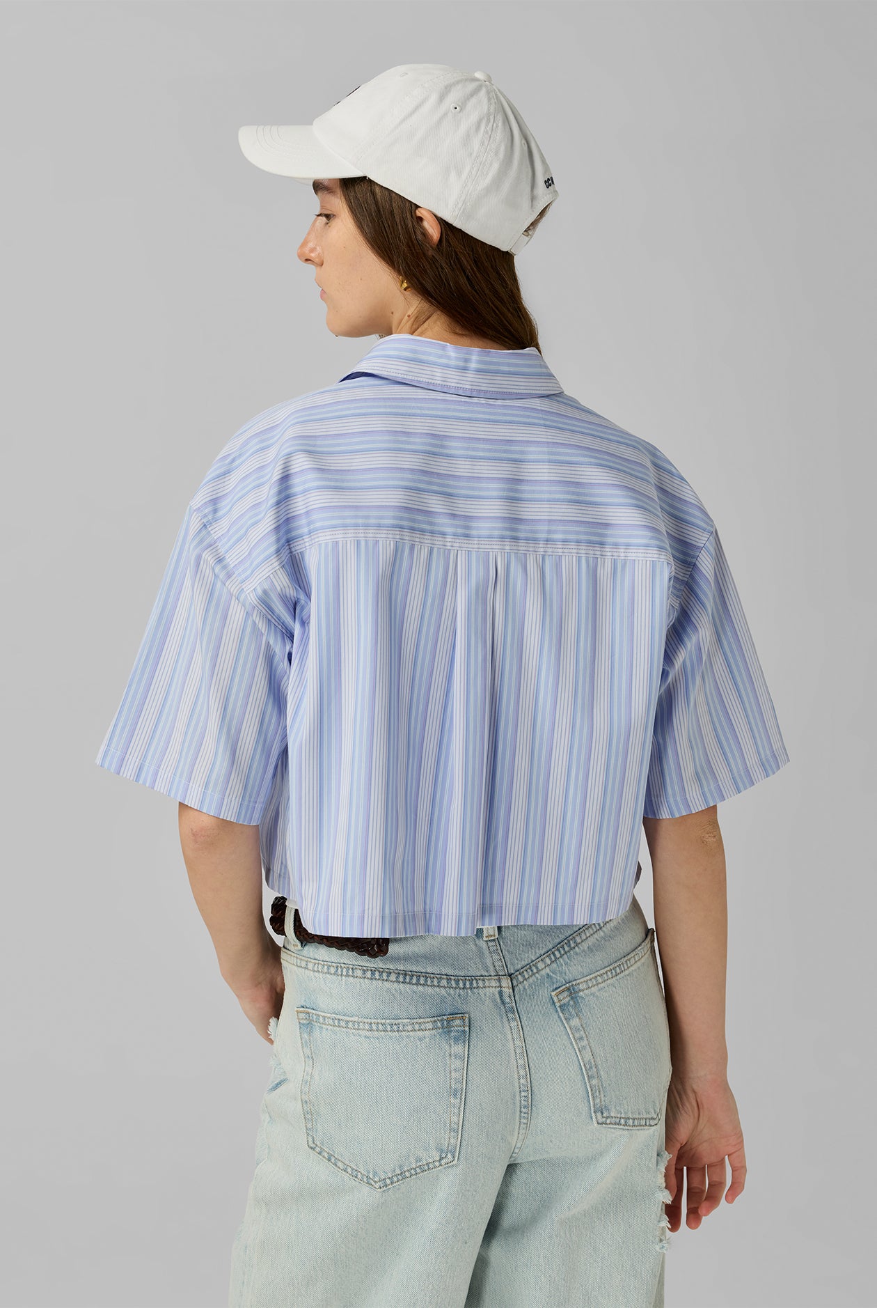 A blue-toned striped short-sleeve shirt featuring a chest pocket for added detail. Made from lightweight cotton poplin, it provides breathable comfort throughout the day. The oversized fit creates a relaxed appearance, making it ideal to wear on its own or layered over an inner top.