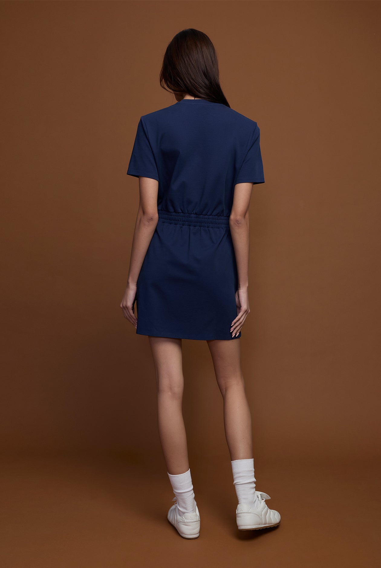 A crewneck short-sleeve T-shirt dress features a smocked waist that fits comfortably and flatters the body. The front is finished with an embroidered crest-style logo, adding a refined sporty-club vibe. The length is perfectly balanced for an easy, active look, and it can be worn on its own for a complete outfit.