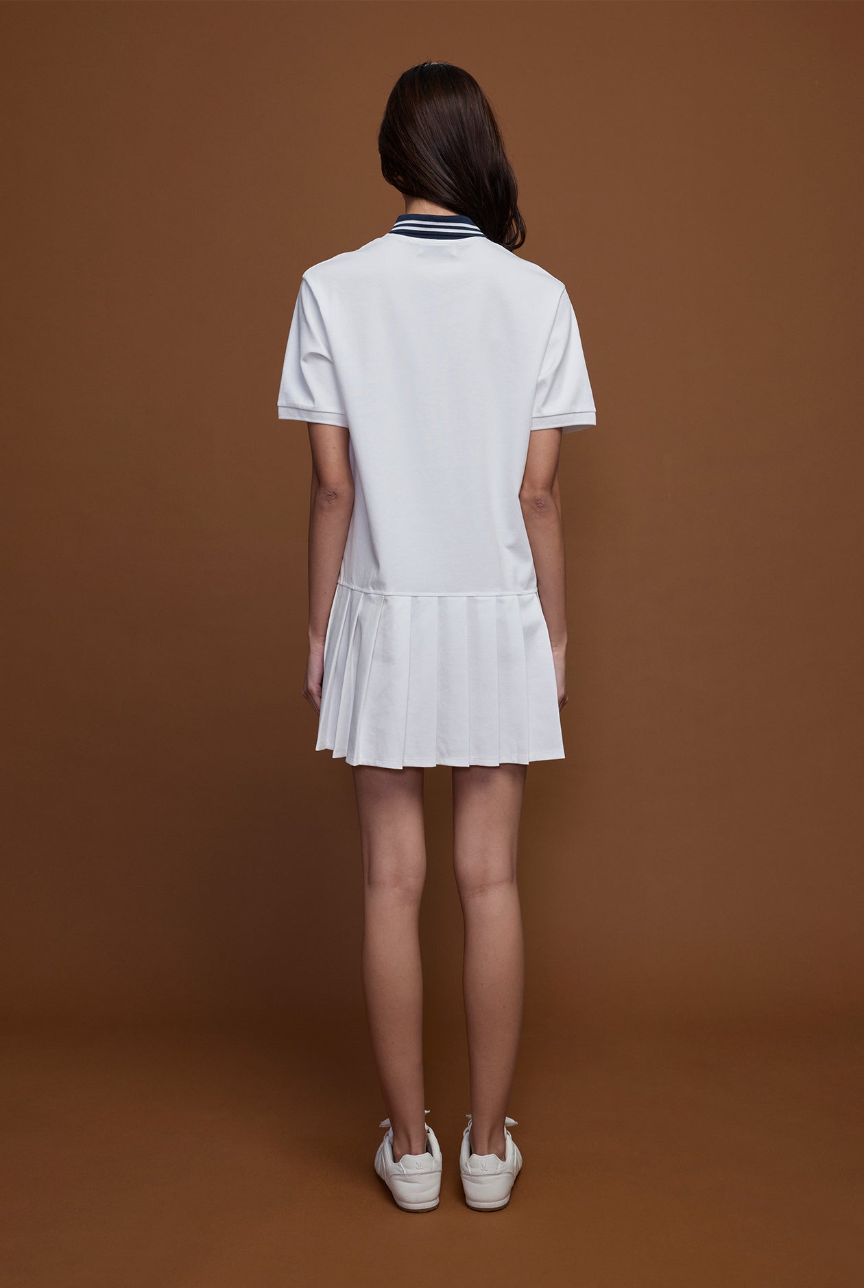 A short-sleeve polo dress features a classic collar with contrast stripe detailing and a short button placket at the neckline. The top has a clean straight fit, creating a minimal sporty-club vibe. The skirt is finished with pleated panels, adding movement and a more design-forward silhouette. Pair it with sneakers to complete an athleisure-inspired look.
