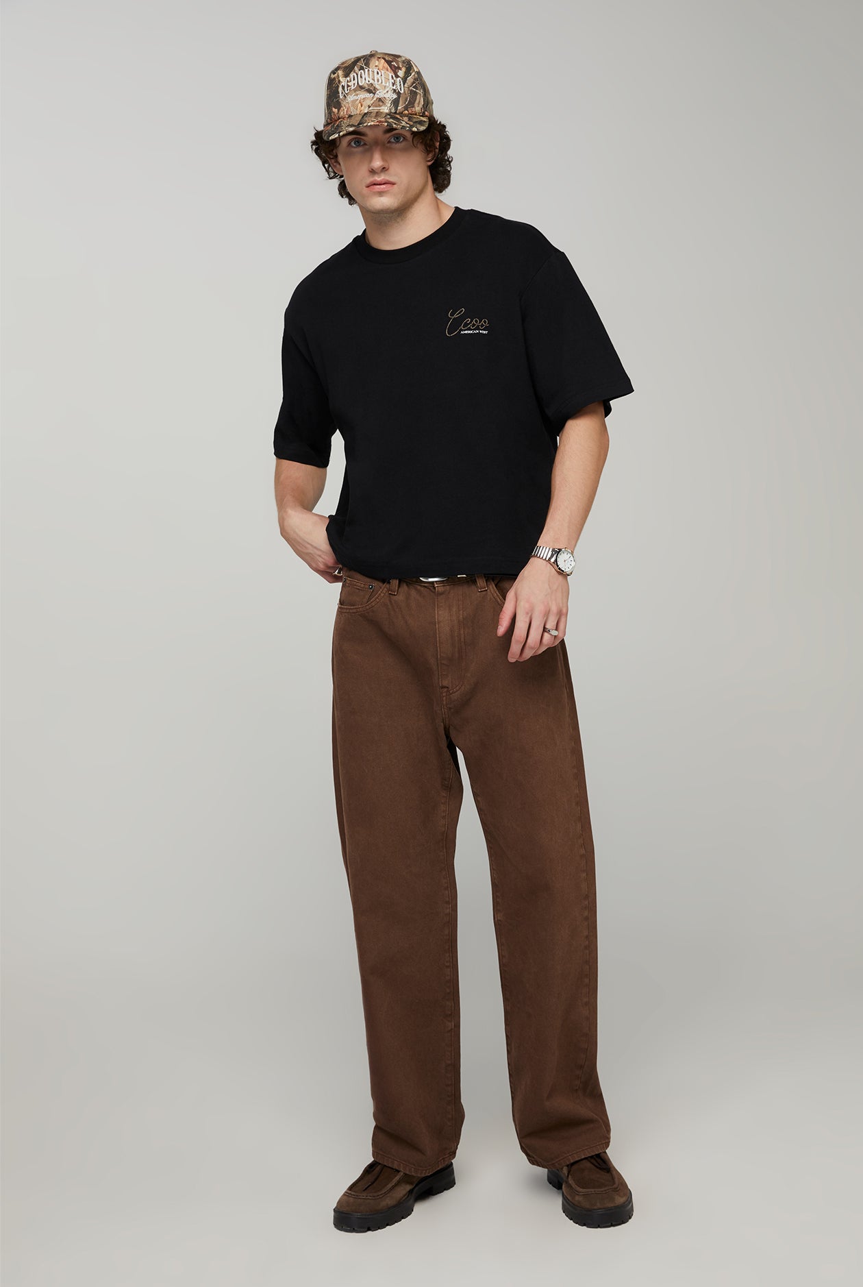 Boxy graphic tee featuring a bold cowboy-on-horse print with the text "RIDERS OF THE WILD WEST" on the back. The chest is detailed with the handwritten lettering CCOO, bringing out a vintage Western vibe. Pair it with jeans for an effortlessly cool and perfectly balanced casual look.