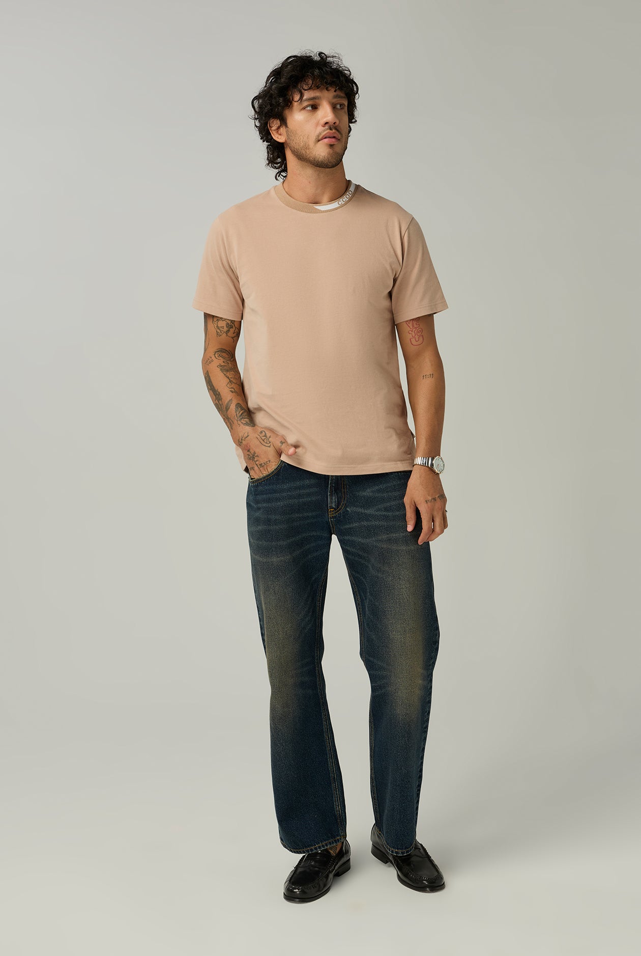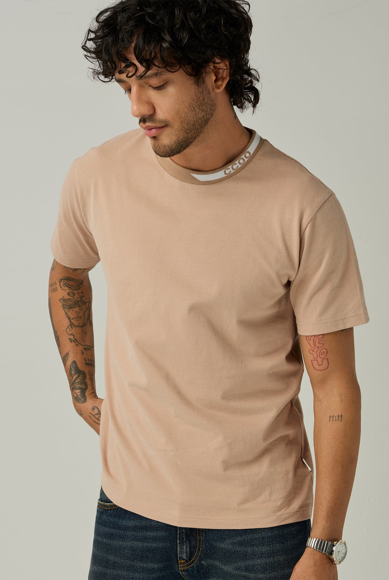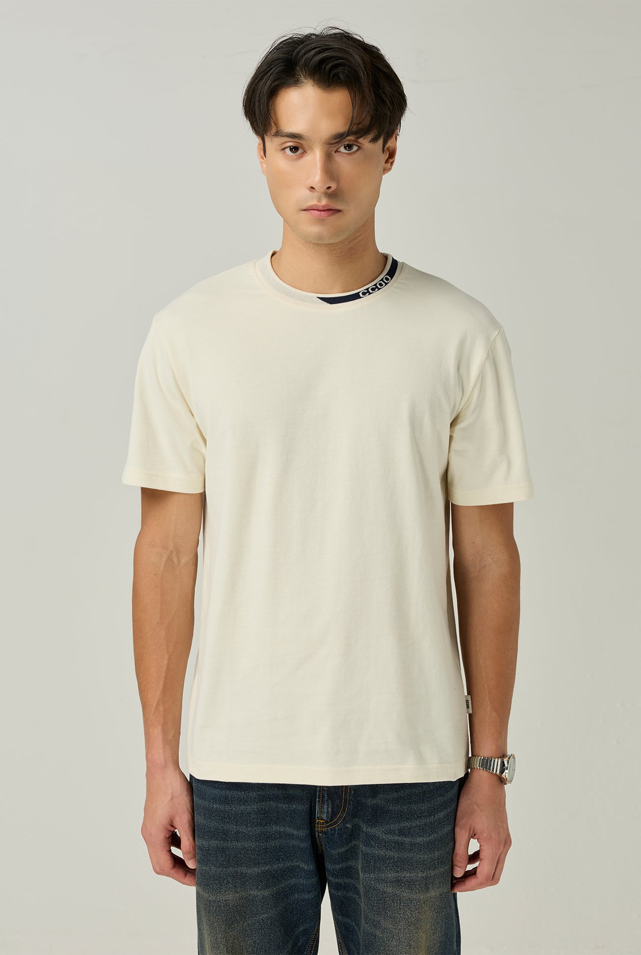 Crewneck T-shirt featuring the CC DOUBLE O logo design on neckline, adding a distinctive touch to your look. The classic color tone allows for versatile styling. Perfect for pairing with jeans, tailored trousers, or casual pants to create a polished outfit suitable for everyday wear.