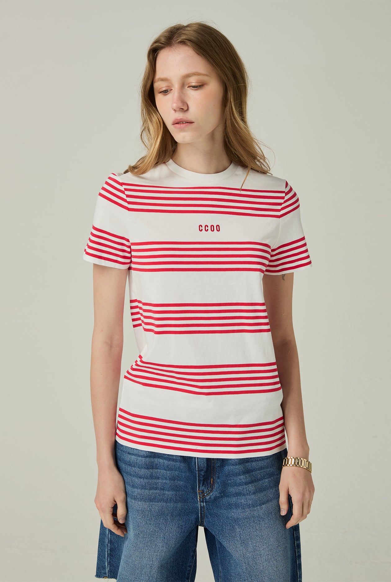 A relaxed-fit tee featuring a four-stripe pattern that adds a subtle graphic rhythm to the design. Crafted with a crew neckline and short sleeves, offering a clean and easy silhouette for everyday wear.