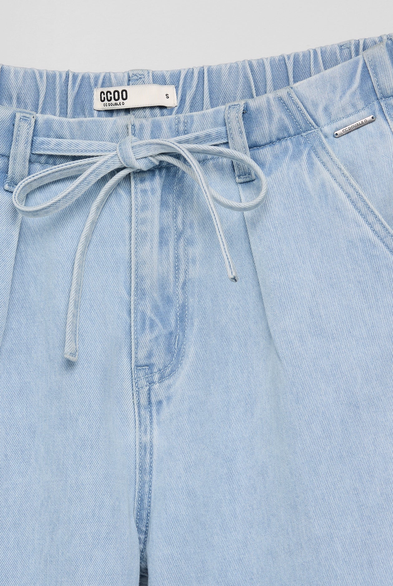 A wide-leg pair of jeans in a light blue denim tone creates a lighter look and is easy to style. The waistband features a drawstring detail for added comfort and an adjustable fit. The front comes with left and right side pockets, along with pleat details at the waist that make the silhouette look neat and more fashion-forward. The straight wide-leg cut is well balanced, helping the legs appear longer.