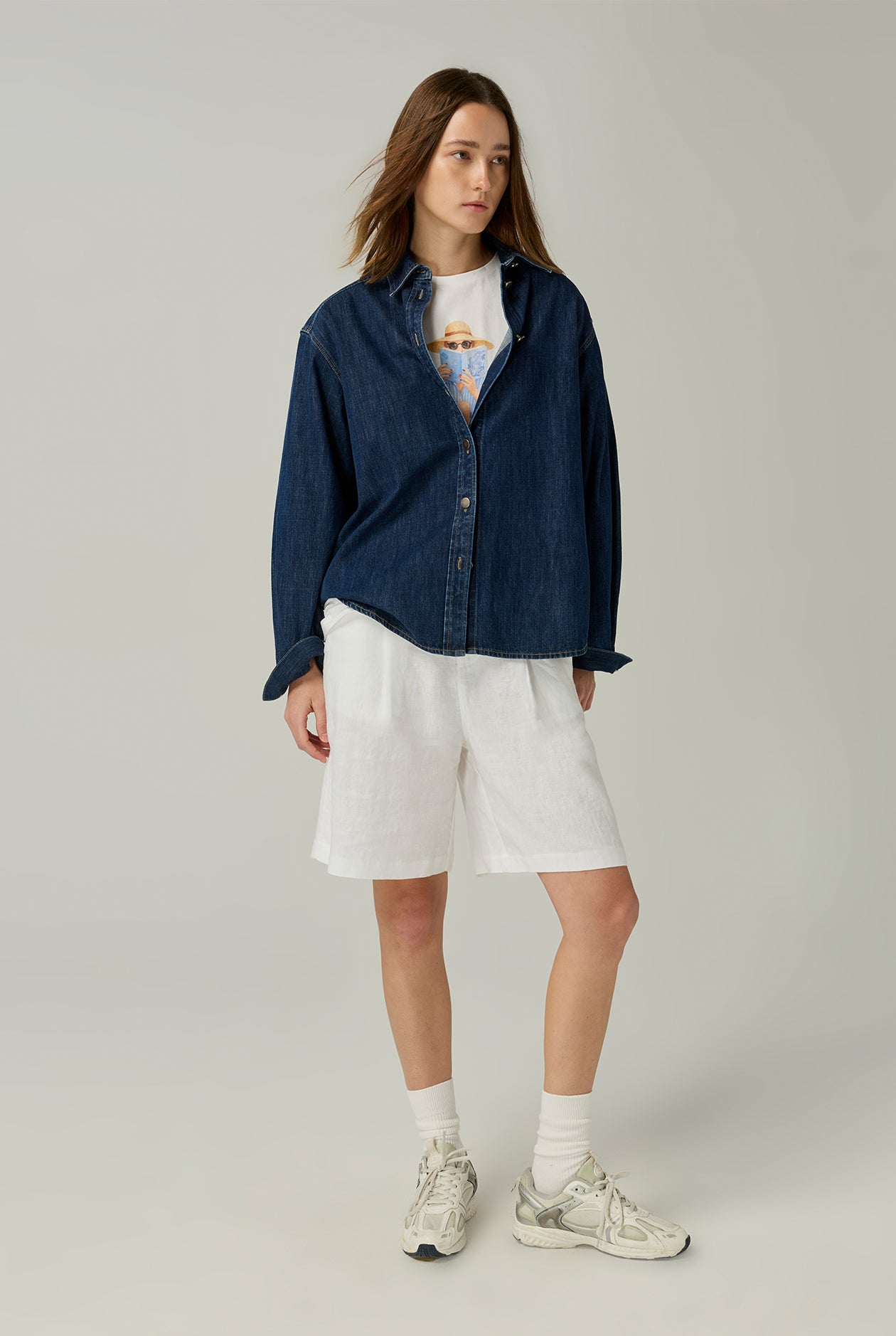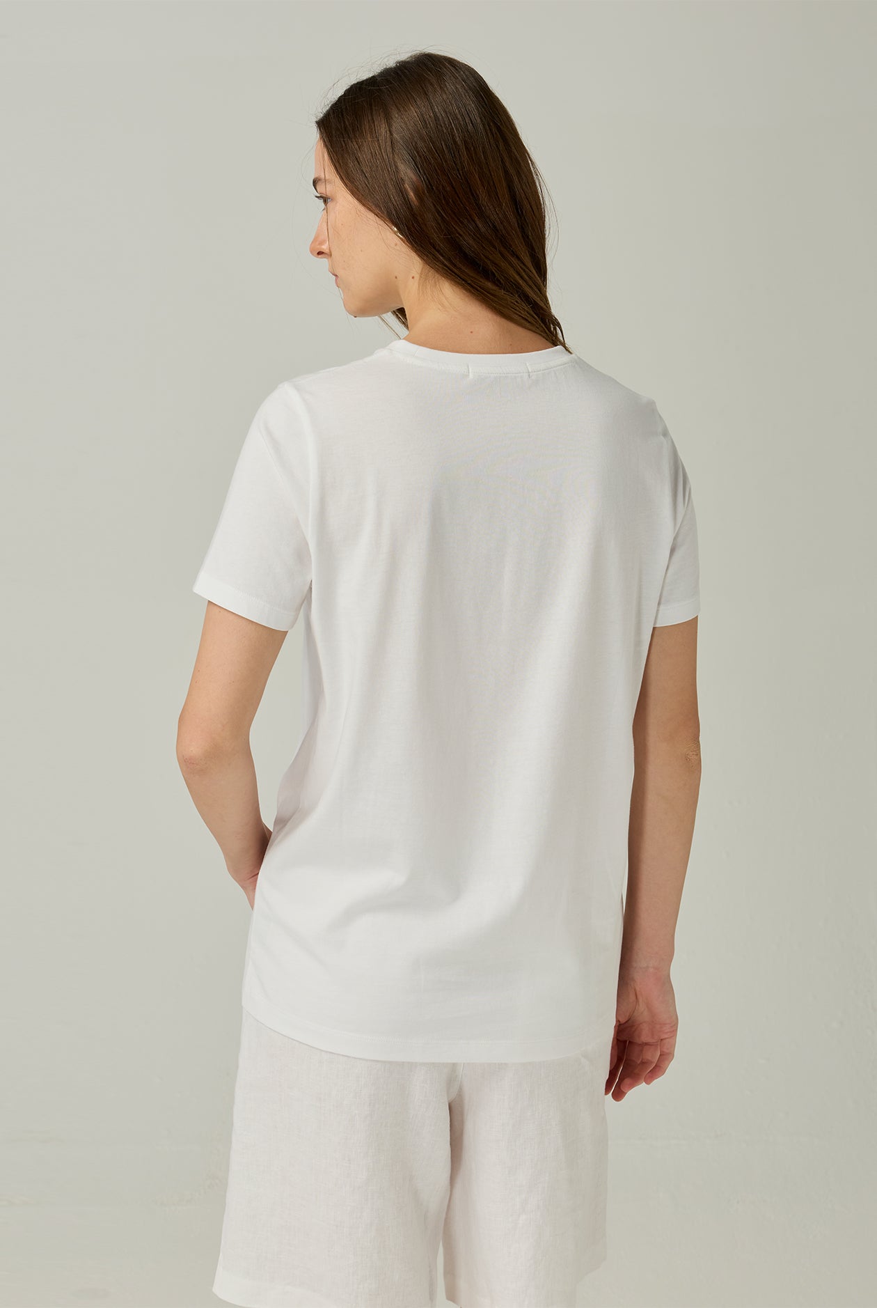 White relaxed-fit T-shirt with a clean and minimal design. Features a front graphic print of a woman in a summer-inspired scene, conveying a fresh and laid-back mood. Made from cotton single jersey fabric with a loose fit for breathable, comfortable wear. Keeps you feeling confident and at ease even in hot weather. Easy to mix and match and perfect for everyday wear, offering a casual yet stylish look.